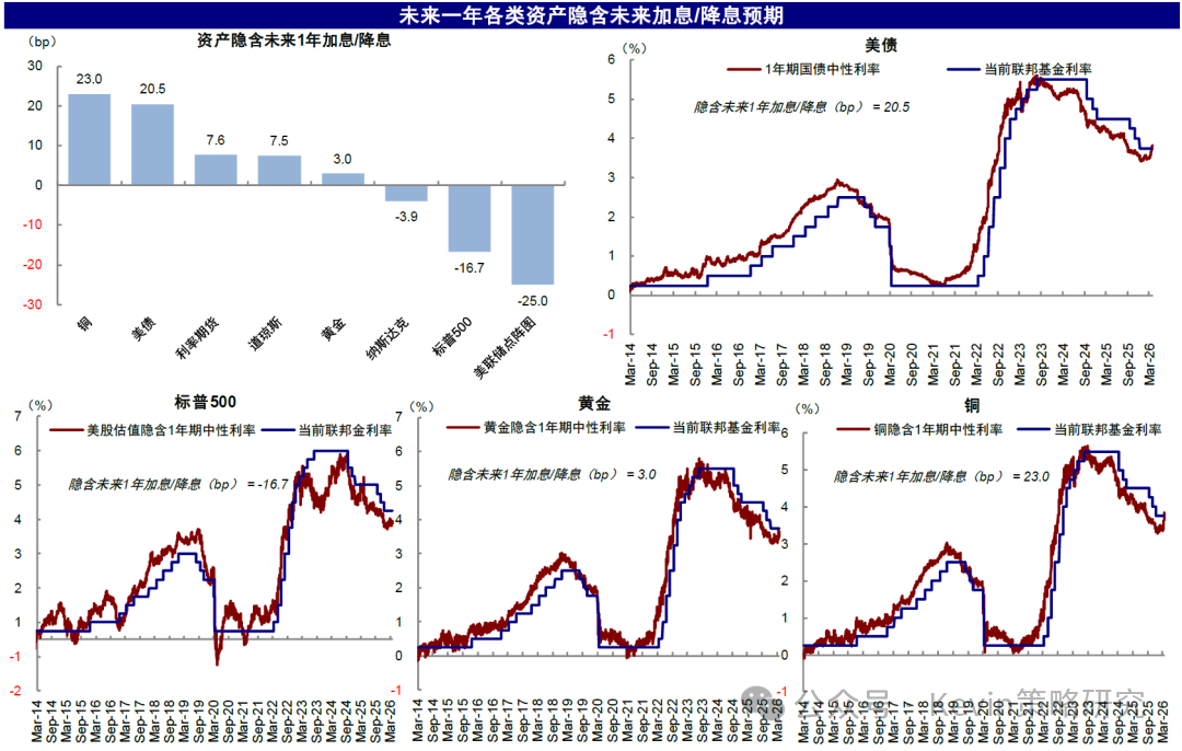 以此为参照,进一步再将不同资产计入的预期拆解出来,就可以发现不同资产的定价差异。具体而言,当前资产计入的未来1年降息幅度为:美联储点阵图(-1次)> 标普500(-0.7次)> 纳斯达克(-0.2次)> 黄金(+0.1次)> 道琼斯(+0.3次)≈ 利率期货(+0.3次)> 美债(+0.8次)> 铜(+0.9次)。