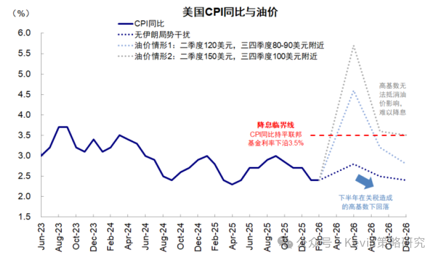 测算的参考基准和桥梁是美联储降息预期。当前,CME利率期货已经将降息预期推迟至2027年12月,降息预期的推后可能并不够直观,“翻译”成对局势本身的判断,就是要油价中枢持续在100美元以上,也就是冲突持续到下半年才能做到,换言之,只要冲突不持续到下半年、油价不持续维持在100美元以上,根据目前美国通胀的路径和实际增长情况,美联储依然是可以降息的,哪怕降息次数减少、降息次数延后。可以见得,当前期货市场对于局势的预期有多么悲观。