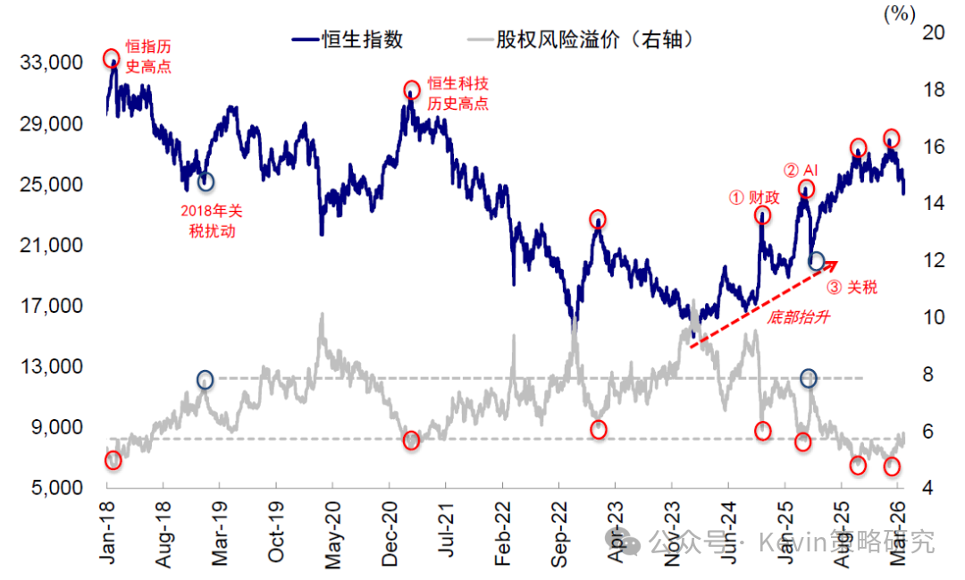 2)中国市场:A股和港股对悲观情形的定价同样不算完全充分。一方面,美债利率与美元波动对估值的压制尚未完全反映,尤其是对流动性更为敏感的港股和A股成长风格与小盘股;另一方面,若霍尔木兹海峡封闭带来的扰动进一步影响东南亚的生产活动,衰退预期升温,也会通过需求逻辑,沿着“外需-周期-科技”的顺序传导:全球需求回落下,国内定价优势发挥作用的空间收窄,出口链或率先承压,如化工、工程机械等;之后压力进一步通过需求和供给扩散至铜、铝等周期品;最后通过利率与风险偏好影响科技板块估值。当前部分出口链与顺周期板块的调整,已经反映了这一传导路径的开端,但指数层面悲观情形尚未被完全计入。