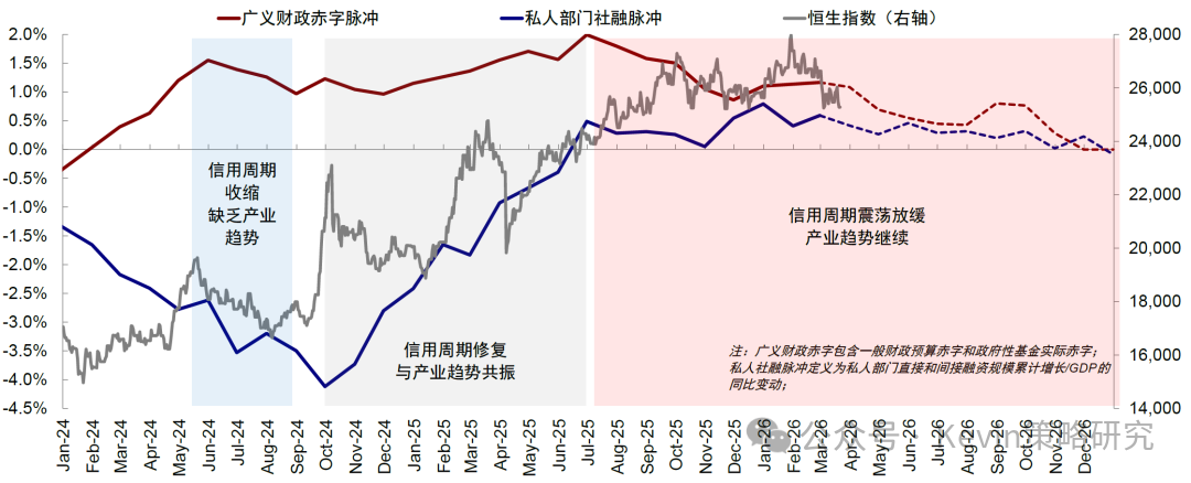 这种情形下,权益资产的下行压力也会得到缓解。不过上行空间的打开,不考虑疤痕效应的话,还是需要来自基本面的支撑。换言之,除部分跌幅较大的市场如恒科外,由于也没有计入很悲观的预期,性价比和弹性也有限。即便没有伊朗局势的扰动,该行原本也判断2026年中国信用周期可能转为整体震荡持平,进而约束指数整体的空间,这也是在年初市场亢奋触及该行的点位时,该行并没有进一步上调点位的原因。此外,二季度信用周期的弱季节性也可能会带来阶段性压力,因此部分投资者选择略降仓位观望或局势明朗后加仓,也不失为一种合理选择。