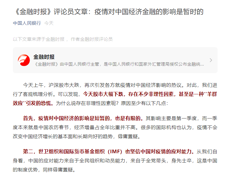 面对股市暴跌,人民银行公众号今日刊出题为《疫情对中国经济金融的影响是暂时的》的评论员文章。