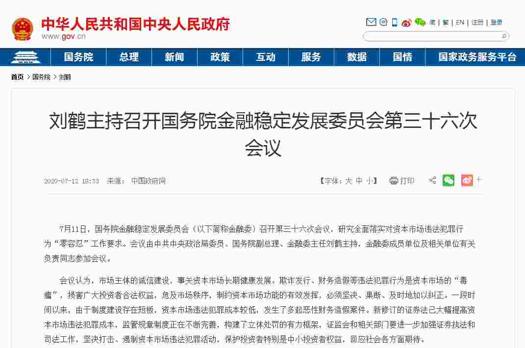 金融委近日召开第三十六次会议,研究全面落实对资本市场违法犯罪行为“零容忍”工作要求,点名了欺诈发行、财务造假等违法犯罪行为。会议由中共中央政治局委员、国务院副总理、金融委主任刘鹤主持,金融委成员单位及相关单位有关负责同志参加会议。