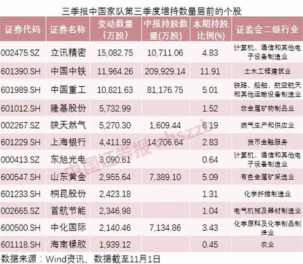 三季度国家队增持规模超过亿股的,有立讯精密、中国中铁、中国重工。苹果概念股立讯精密三季报显示,今年三季度,4只中证金融资产管理计划新进成为立讯精密的第7-第10大流通股股东,共计增持约1.19亿股。同时,汇金和证金三季度共计增持约3200万股。