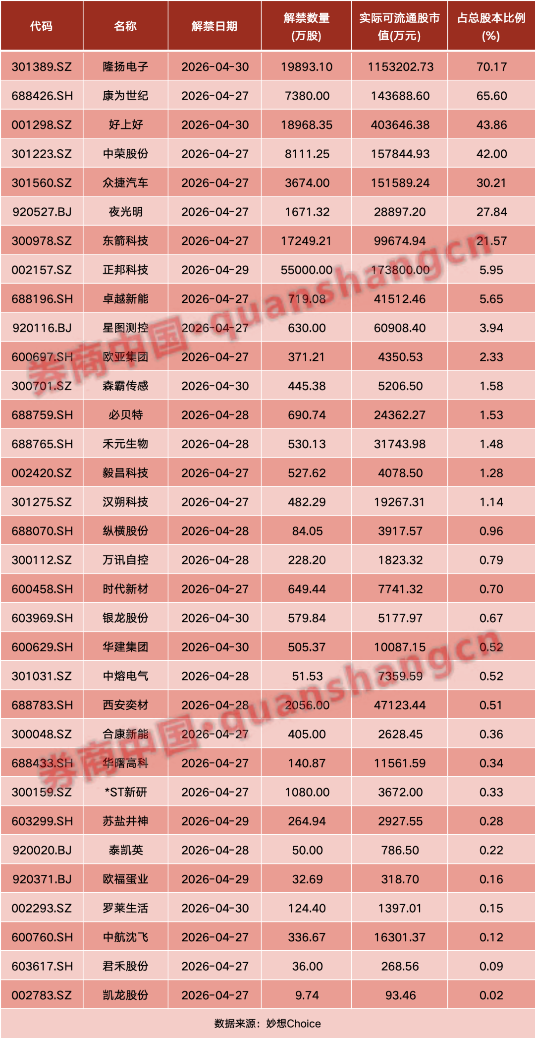 从解禁市值来看,居前三位的是:隆扬电子(115.32亿元)、好上好(40.36亿元)、正邦科技(17.38亿元)。
