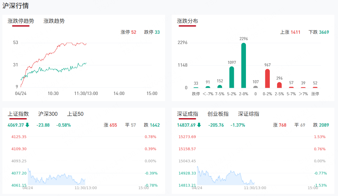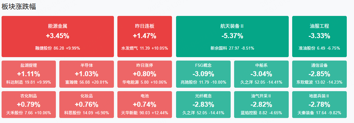 板块方面,CPU、电子特气等芯片产业链、锂电池、绿色电力、业绩超预期等板块表现活跃,油气、影视院线等板块表现落后。截至午间收盘,沪指跌0.58%,深成指跌1.37%,创业板指跌2.2%。