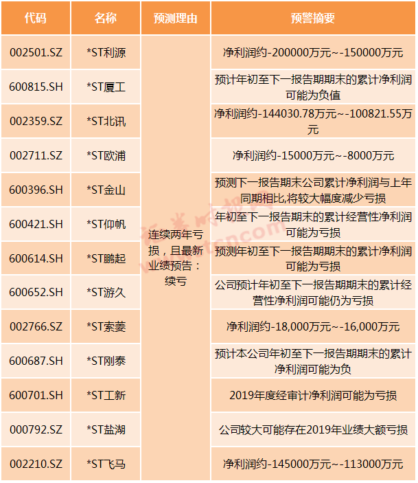 4、*ST公司中,13公司预计年报“续亏”,存暂停上市可能。