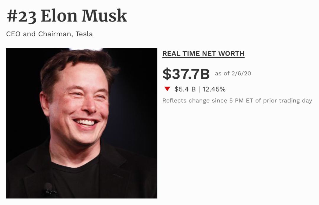 随着特斯拉股价的攀升,马斯克也跃升实时福布斯富豪榜前20名,而2月5日股价的暴跌,使其暂且位列第23名。