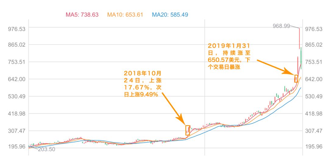 暴涨缘何?要先追溯到2018年10月24日。在Q3财报盈利的刺激下,特斯拉股价正式开始攀升之路。