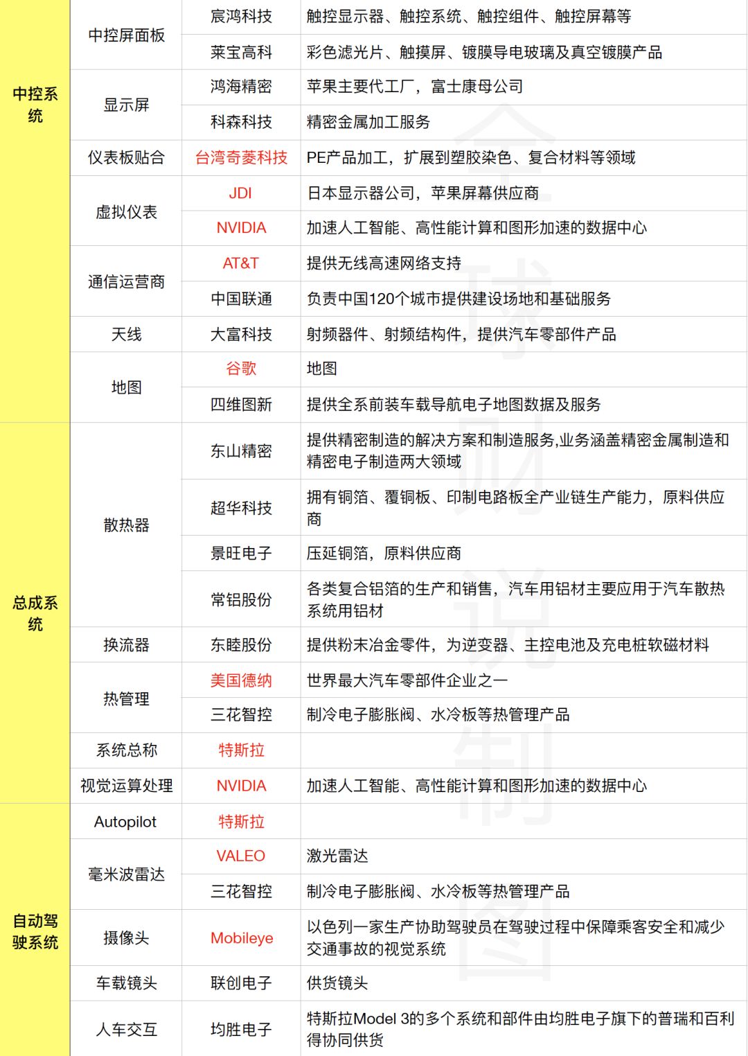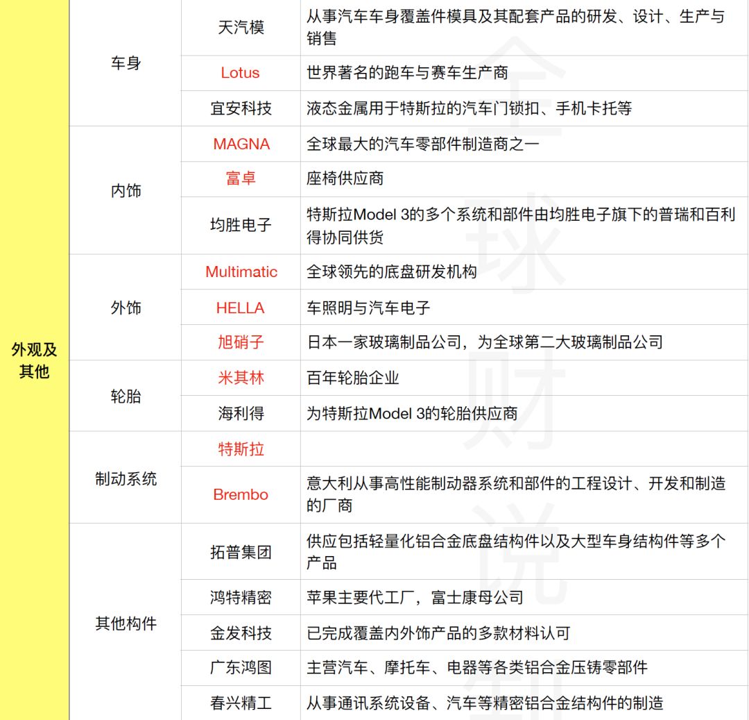 苹果概念股立讯精密9年涨幅20倍,那特斯拉概念股呢?下图是《全球财说》为大家汇总的最全特斯拉概念股(标红为国外及中国台湾地区企业)。