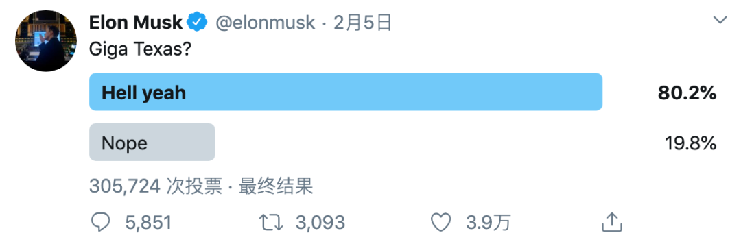2月5日,马斯克在推特上发起了一项投票,“Giga Texas?”,虽然只是个疑问,但是对于超级工厂(Gigafactory)的期待,依旧吸引来逾30万的投票。