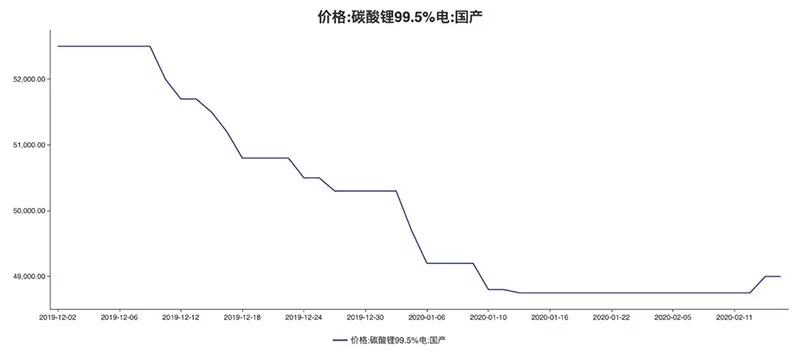 上海有色网显示,工业级、电池级碳酸锂在2月14日的报价分别为3.875万元/吨、4.9万元/吨,其在1月10日开启了横盘走势,于2月13日出现了首次涨价,涨幅为250元/吨。