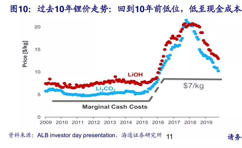 海通证券认为,2018年初至今,锂盐价格一直下跌。2020年2月,碳酸锂、氢氧化锂的价格分别跌至48750元/吨和54500元/吨,仅略高于2009年的低位(碳酸锂42500元/吨,氢氧化锂40500元/吨),跌到了现金成本水平(7美元/千克)附近。因此,价格回升在望。