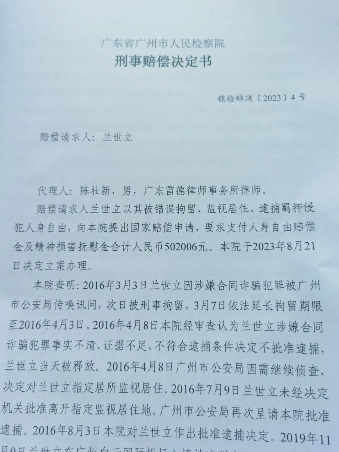 10月25日,兰世立高调召开新闻发布会,宣告自己已收检察院下发的国家赔偿决定书,赔偿金金额合计59万余元。