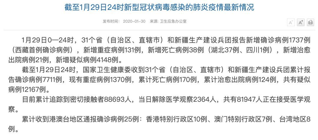 1月29日0—24时,31个省(自治区、直辖市)和新疆生产建设兵团报告新增确诊病例1737例(西藏首例确诊病例),新增重症病例131例,新增死亡病例38例(湖北37例、四川1例),新增治愈出院病例21例,新增疑似病例4148例。