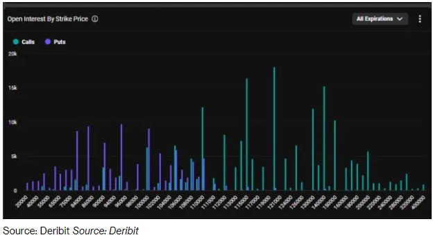 随着比特币首次突破11.6万美元关口,Deribit交易所的未平仓合约明显集中于执行价为11.5万和12万美元的看涨期权。更长期限的9月底和12月到期期权,其未平仓合约更是集中在14万和15万美元的高位。