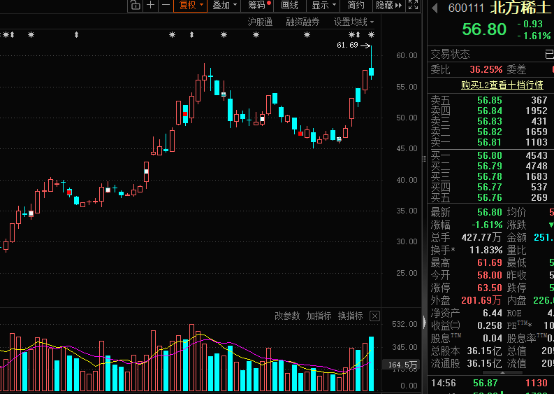 稀土作为小金属板块最受关注的品种之一,在近期的表现中可圈可点。其中,市值超过2000亿元的稀土之王,北方稀土(600111)今天(10月14日)股价盘中创出历史新高,全天成交额251.1亿元,位居A股第一位。