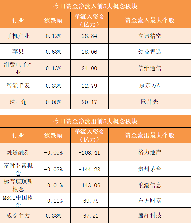概念板块方面,今日手机产业、苹果、消费电子产业、智能手表等概念板块资金呈现净流入,其中手机产业概念净流入28.84亿元居首。