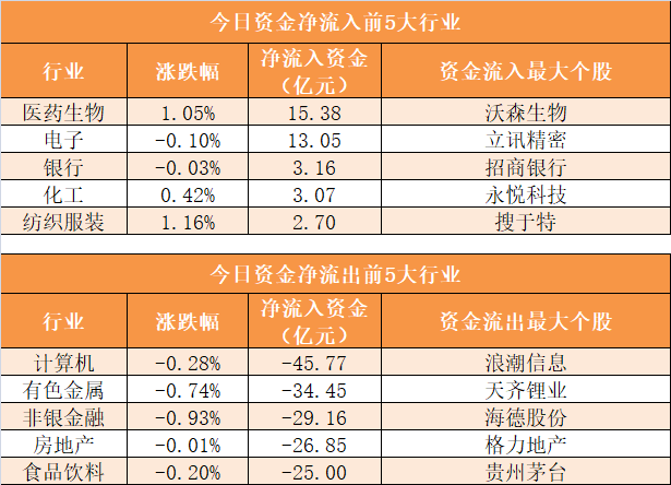 28个申万一级行业中,8个行业实现资金净流入,其中医药生物行业净流入15.38亿元居首。