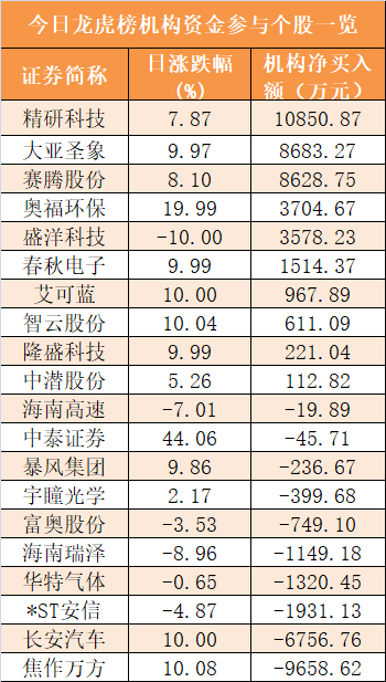 盘后龙虎榜数据显示,机构现身20股,其中精研科技等10股呈现机构资金净买入,焦作万方等10股呈现机构资金净卖出。