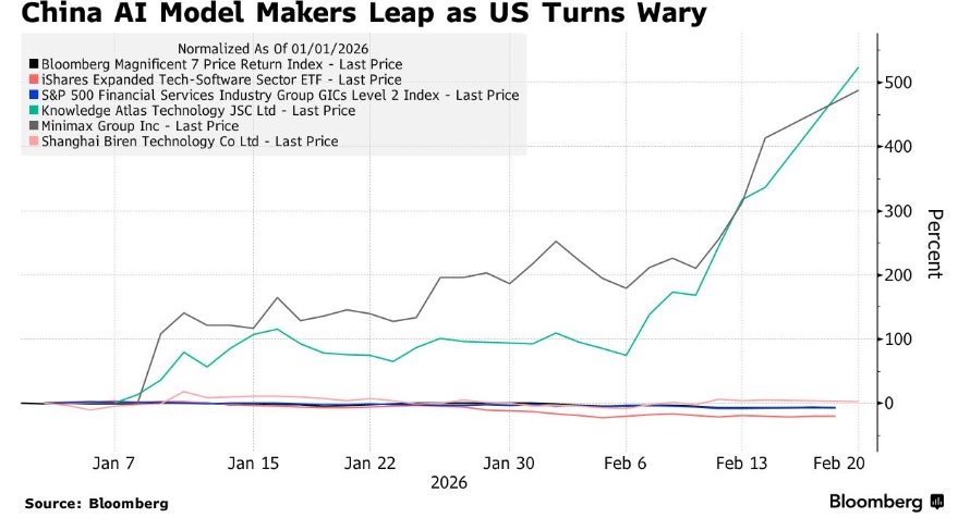 当美国金融市场陷入"AI颠覆一切的AI恐慌交易",投资者们大举抛售SaaS软件公司之际,中国投资者却在大举追捧人工智能相关概念股。这种截然不同的市场情绪反映出两地投资者对于前沿AI技术的根本性分歧:美国市场担忧既有商业模式被颠覆,中国投资者们则聚焦于在最高法院宣布此前特朗普对等关税违法之后的经济增长机遇以及在AI应用市场规模无比庞大的中国加速开源AI大模型渗透带来的企业降本潜力。