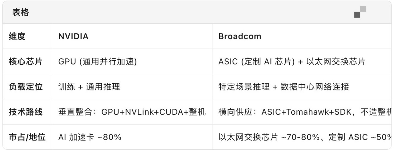 博通时而被认为是英伟达“第二梯队”竞争者,但事实上博通是另一种赛道上的隐形巨头。英伟达和博通的关系类似于GPUvsASIC(定制 AI 芯片)、垂直平台 vs 横向芯片、训练 vs 推理。双方更多是互补以及部分重叠的关系。