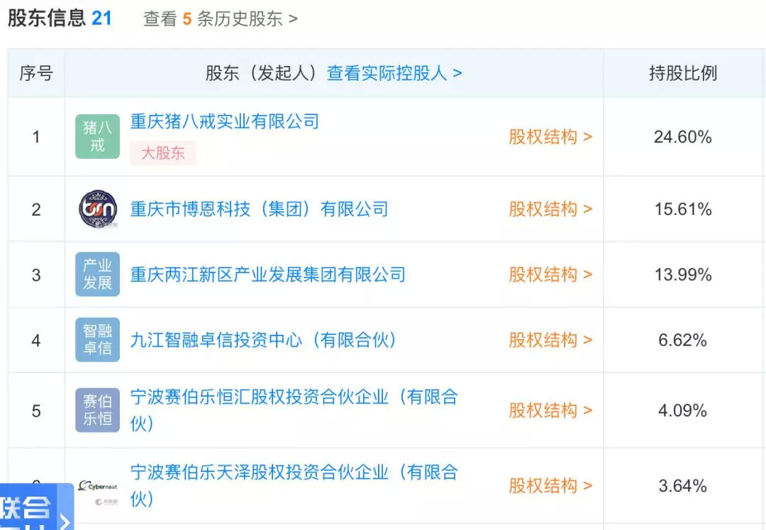 八戒网络现在共有21名股东。其中,朱明跃控股99%的重庆猪八戒实业有限公司持股比例为24.60%,为第一大股东;此外,重庆市博恩科技(集团)有限公司、重庆两江新区产业发展集团有限公司、赛伯乐投资等机构持股比例均在10%以上。