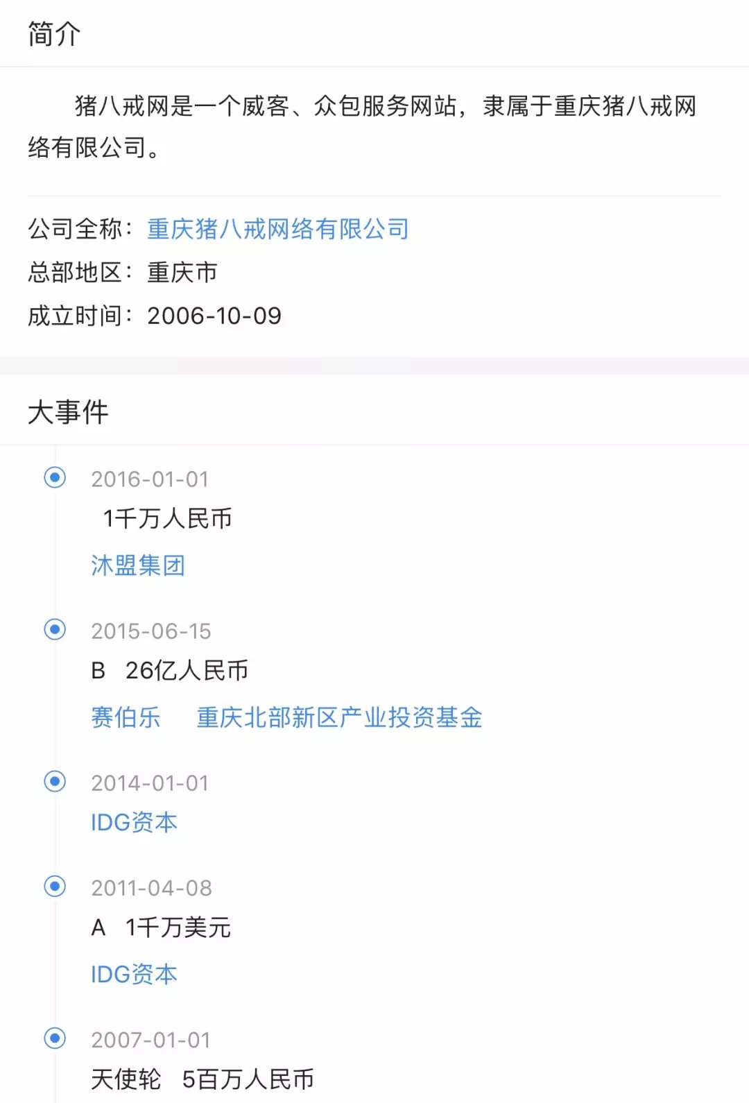 2011年4月,IDG资本向猪八戒网注资1000万美元。实际上,IDG资本在2007年左右就注意到了猪八戒网,但当时IDG认为威客模式前景不明,并不看好。直到2011年,IDG投资人到重庆考察其他项目,意外发现猪八戒网竟然还活得不错,最终决定投资入股。