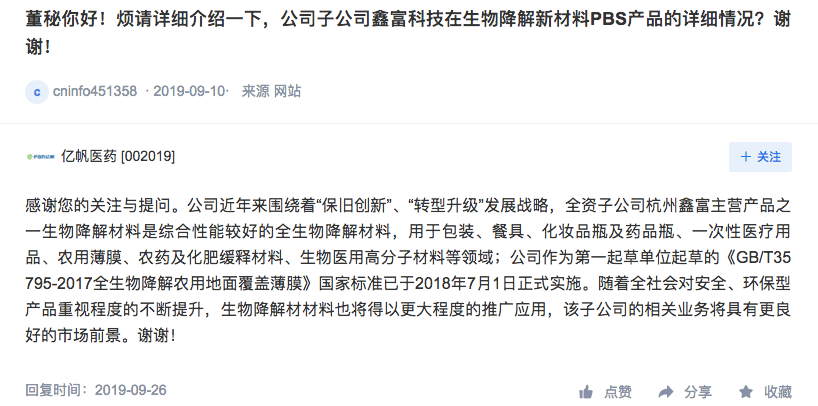 亿帆医药2019年就鑫富科技在深交所互动易平台上答投资者问