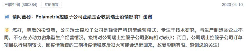 三联虹普称,公司及瑞士子公司Polymetrix受疫情影响均较小,在手订单稳定实施,业绩保持增长趋势。截至目前,行业客户持续复工,公司在执行项目均已恢复正常,整体经营情况稳定。