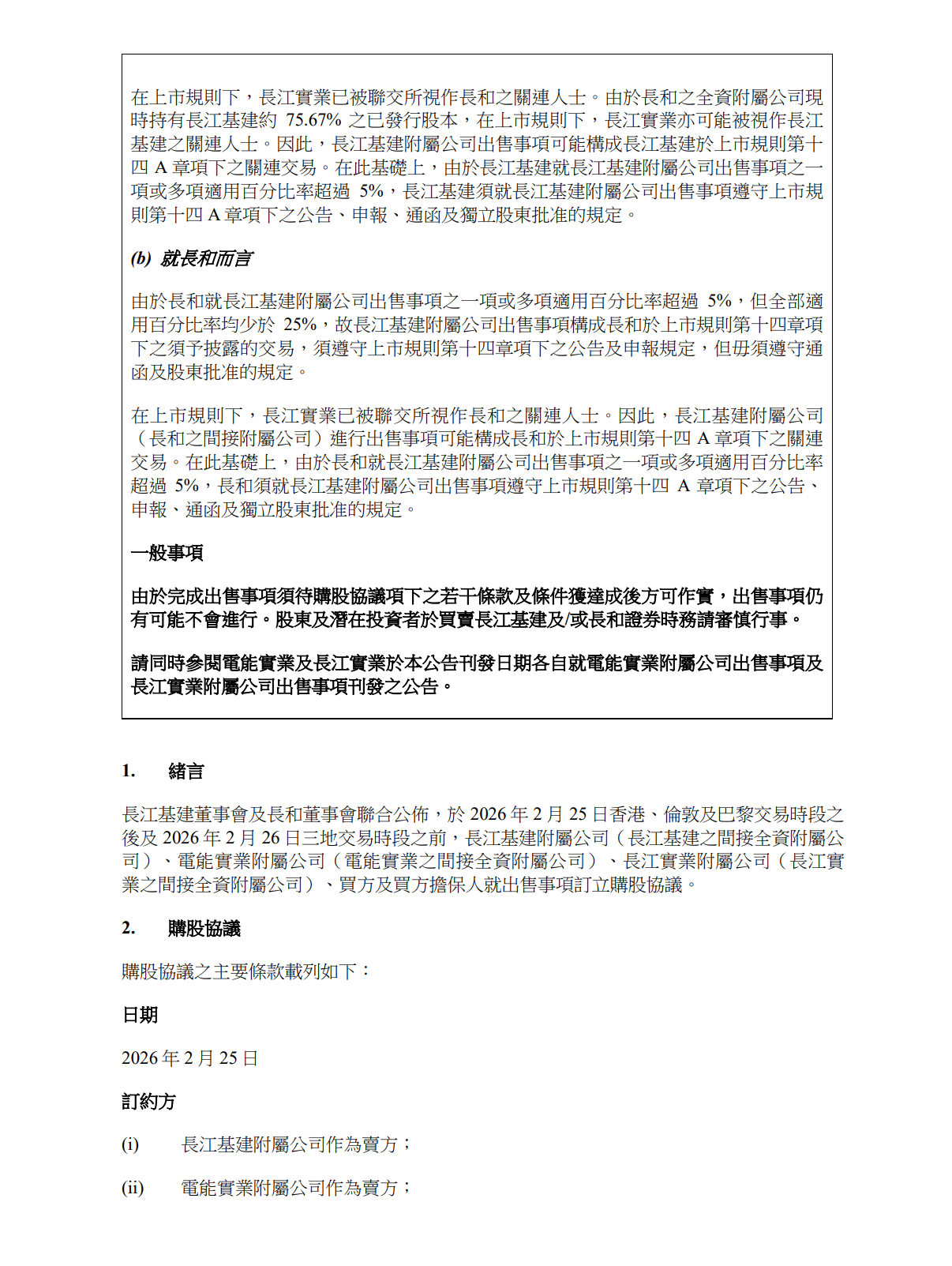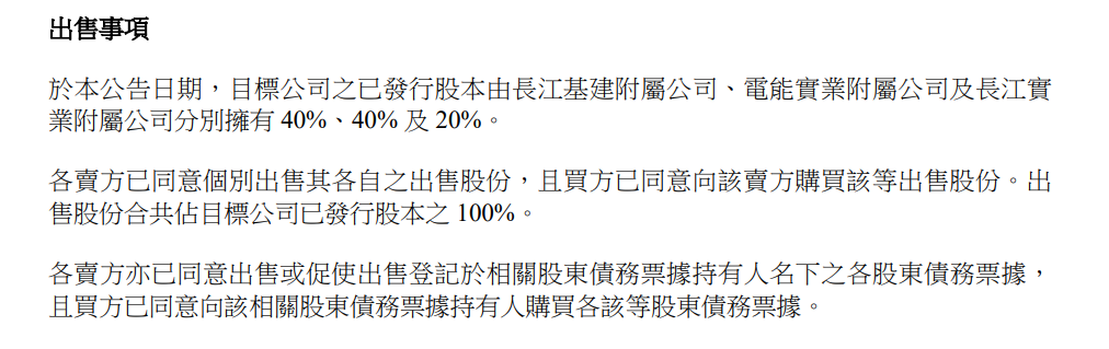 电能实业:出售其持有的40%权益,基本代价同为42.19亿英镑,约合443.02亿港元。