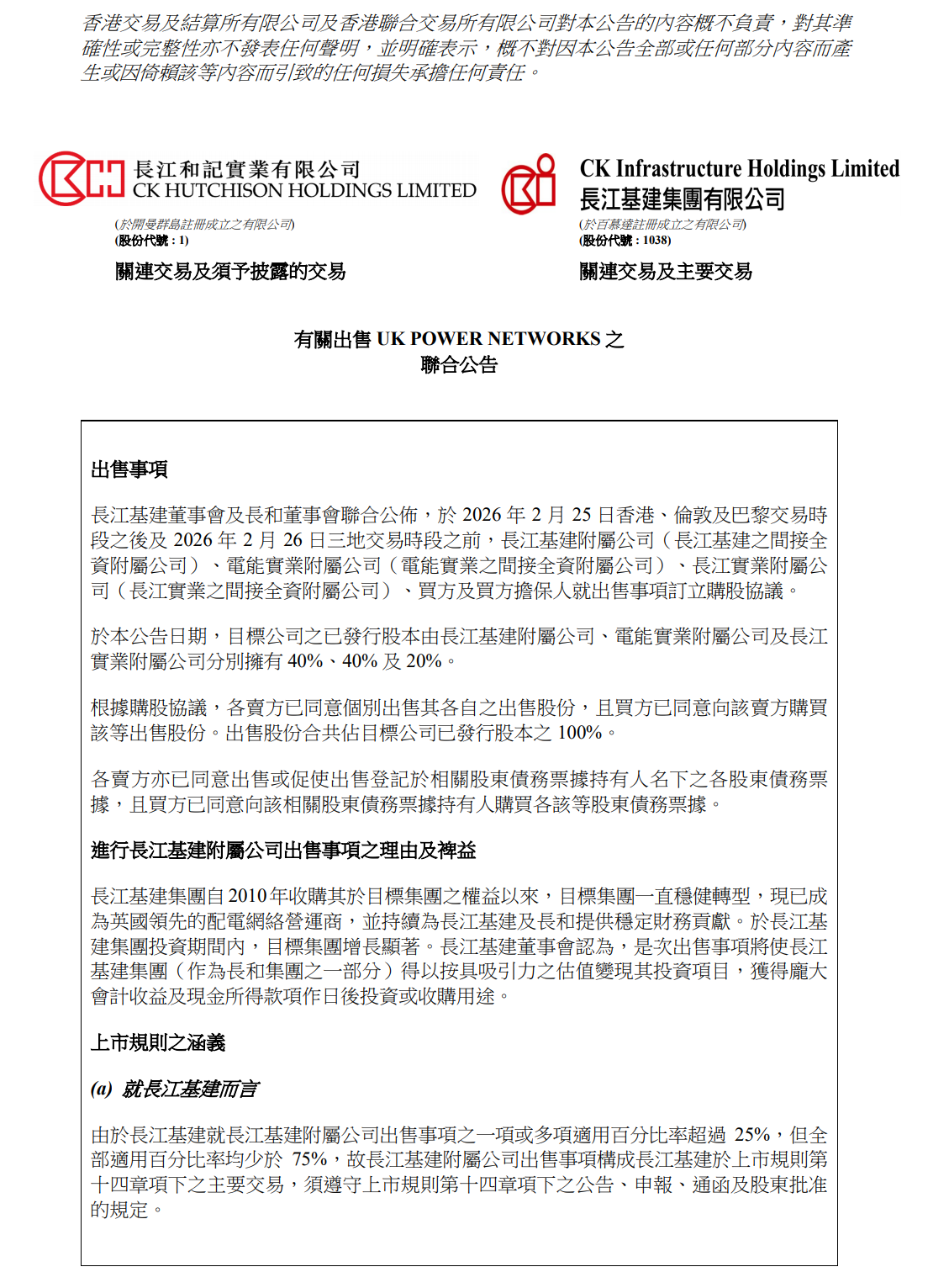 长和系旗下三家核心上市公司——长江基建集团、电能实业及长实集团联合发布公告,宣布将所持英国电网运营商UK Power Networks(UKPN)的全部权益出售给法国公用事业巨头Engie,此次交易总作价超过1100亿港元。