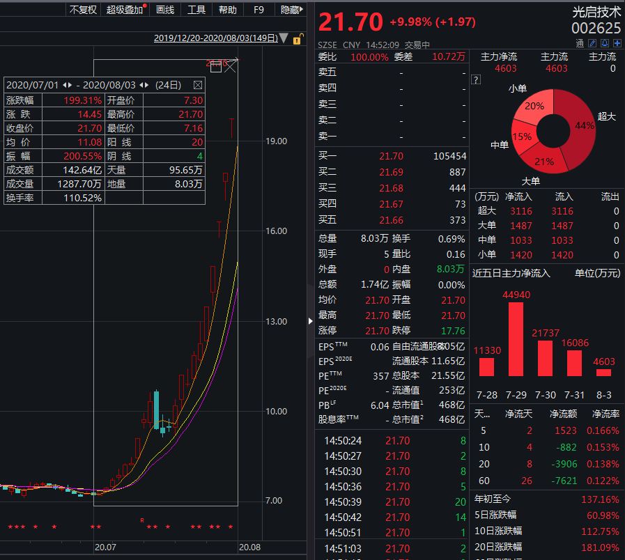自7月3日至今,光启技术股价已涨近200%,其中22个交易日涨停数为8个。