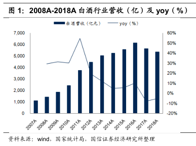 实际上白酒已进入存量博弈的时代。2007年到2018年,白酒行业市场规模从1090亿元增长至5364亿元,在此期间年化增长率15.6%。但是进入2014年以来,白酒行业进入调整期,总营收增速增速持续降低,2017年和2018年甚至出现负增长。
