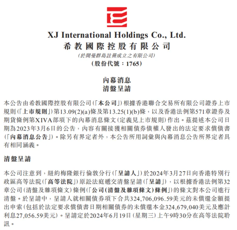 3月28日,在港股上市的希教国际控股公告,纽约梅隆银行伦敦分行向香港法院提交了清盘呈请。