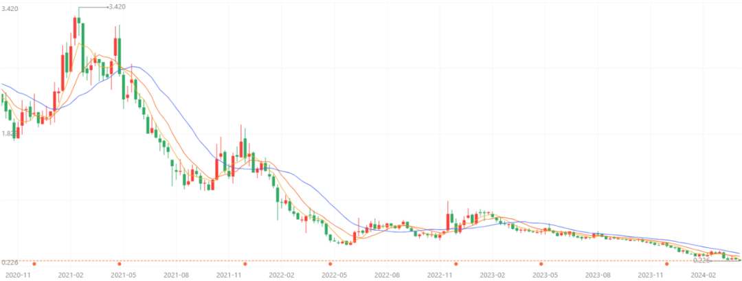 彼时公司股价还在蒸蒸日上,投资者以为赚了便宜。结果到2021年年中,画风突变,公司股价一路暴跌,此后再也没翻身过。
