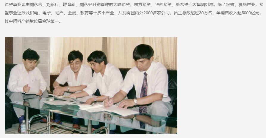 经过多年的开枝散叶,由刘氏兄弟缔造的“希望系”,足迹遍布农牧、食品、铝电、电子、地产、金融、教育等十多个产业,年收入超5000亿元,员工总数超过30万。