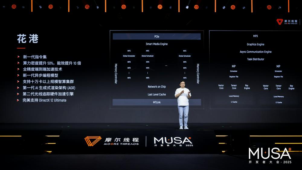 摩尔线程创始人、董事长兼CEO张建中介绍,新发布的GPU架构“花港”, 基于新一代指令集,算力密度提升50%;支持从FP4到FP64的全精度端到端计算,新增MTFP6/MTFP4及混合低精度支持。集成新一代异步编程模型,优化任务调度与并行机制;通过自研MTLink高速互联技术,支持十万卡以上规模智算集群扩展。