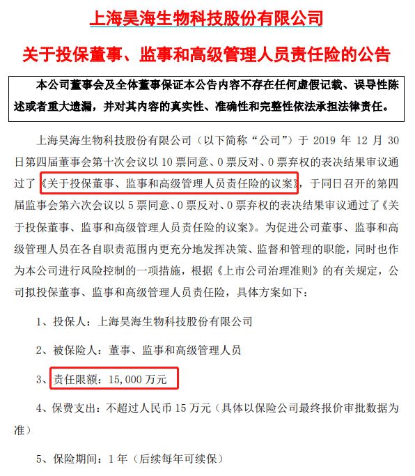 面对如此惩戒力度,已有上市公司为自家董监高买好了责任险。昊海生科去年12月30日表示,为促进公司董监高在各自职责范围内更充分地发挥决策、监督和管理的职能,同时作为一项风控措施,拟投保保额1.5亿元的董监高责任险。