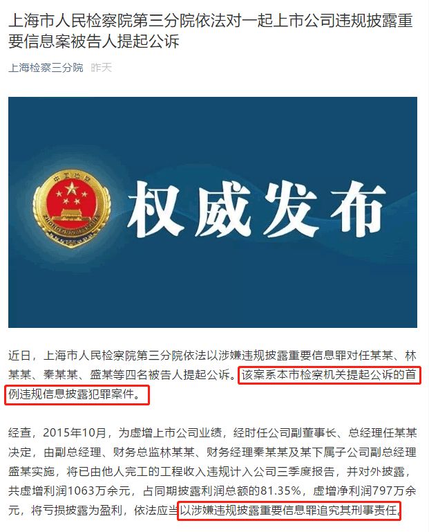 据悉,此案是上海市检察机关提起公诉的首例违规信息披露犯罪案件!当事人还可能被追究刑事责任!
