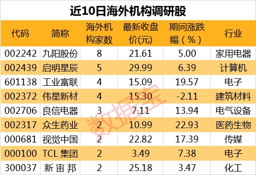 海外机构调研榜单中,九阳股份参与调研的海外机构达到8家,最受关注;其次是启明星辰,参与调研的海外机构共有5家。