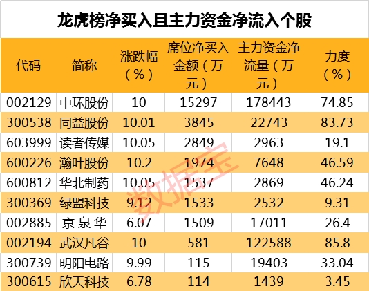 从盘口资金流向来看,主力资金净流入超千万且龙虎榜净买入个股共有10只,其中中环股份、武汉凡谷、同益股份等个股资金净流入金额最大。净流入力度最大的个股有武汉凡谷、同益股份、中环股份,净流入力度分别为85.8%、83.73%、74.85%。