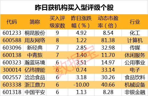 昨日机构研报共发布254条买入型评级记录,共涉及128只个股。桐昆股份关注度最高,共获9次机构买入型评级记录。