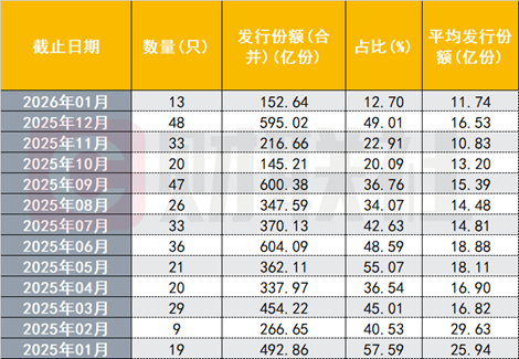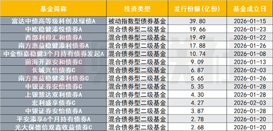 据财联社统计,以基金成立日计,开年至今已发行债券型基金17只,份额合计170.25亿份。其中,1月债基发行13只,份额合计152.64亿份。