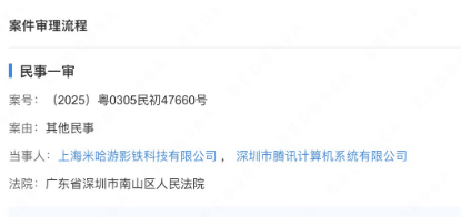 企查查信息显示,日前,上海米哈游影铁科技有限公司有一项最新的开庭公告,涉及与深圳市腾讯计算机系统有限公司之间新增的一项“其他民事”诉讼案件,案号为(2025)粤0305民初47660号。