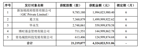 6月4日晚,兆易创新披露非公开发行股票发行结果暨股本变动公告,兆易创新以203.78元/股价格,向新加坡政府投资有限公司(GIC)、葛卫东、毕永生、博时基金、青岛城投科技发展有限公司5家发行对象共非公开发行2121.91万股股份,募集资金总额达43.24亿元。