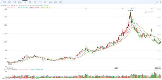 在国产替代和政策红利的大背景下,2019年A股半导体板块全面崛起。作为国内存储芯片龙头,兆易创新在资本市场也受到资金青睐,几乎是所有科技类基金的压舱股,2019年股价累计上涨229%,2020年初股价继续上涨,到2月时股价近乎翻倍,最高价格为428.18元/股,总市值达1375亿元。3月初开始,半导体概念普遍“降温”,尽管五一前后中芯国际将回归A股的消息让半导体板块回暖,持有中芯国际部分股权的兆易创新股价也有回升,但截至6月4日收盘,兆易创新股价为205.66元/股,相比今年2月最高价格已跌去32%(复权价)。