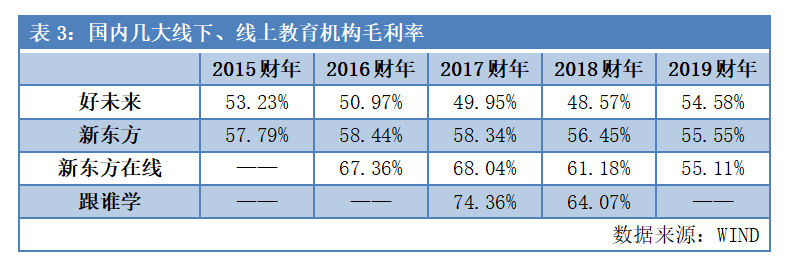 在线教育的营业成本前期主要是研发投入,包括教师教案、设备等等,直播课程只要平台容量支撑,对于录播类1对多课程,一个老师理论上可以给无限同学上课,所以在线教育有一个很明显的优势,毛利率较高,如2017财年,跟谁学(GSX.NYSE)的毛利率高达74%,新东方在线的毛利率达到68%,而综合性业务的好未来和新东方,同期毛利率分别为50%、58%(表3)。