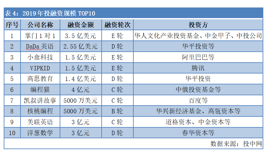 据投中网统计,2019年教育行业投融资共305起,其中36家企业融资金额过亿,在融资金额TOP10中,有包括掌门1对1、DaDa英语、VIPKID、高思教育、凯叔讲故事、美联英语、洋葱数学7家在线教育机构,合计融资规模超过10亿美元(表4)。