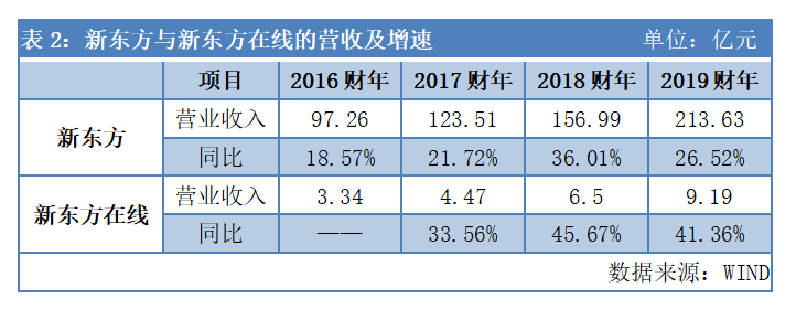 2020财年第二季度,好未来集团旗下的学而思网校贡献了16%的收入,收入同比增加近94%。新东方和新东方在线2019财年的收入分别为213.63亿元和9.19亿元,而且,新东方在线的增长速度更快,2019财年达到了41.36%(表2)。