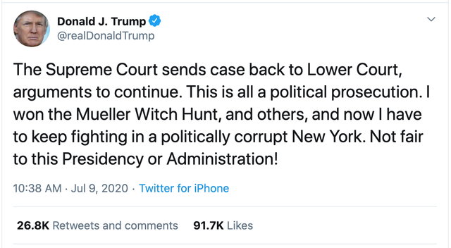 高等法院的裁定宣布后,特朗普在推特上称,这一切都是政治迫害。“我赢了穆勒的政治迫害,以及其它的,现在我还得在政治腐败的纽约继续斗争。对这届总统和政府太不公平了!”